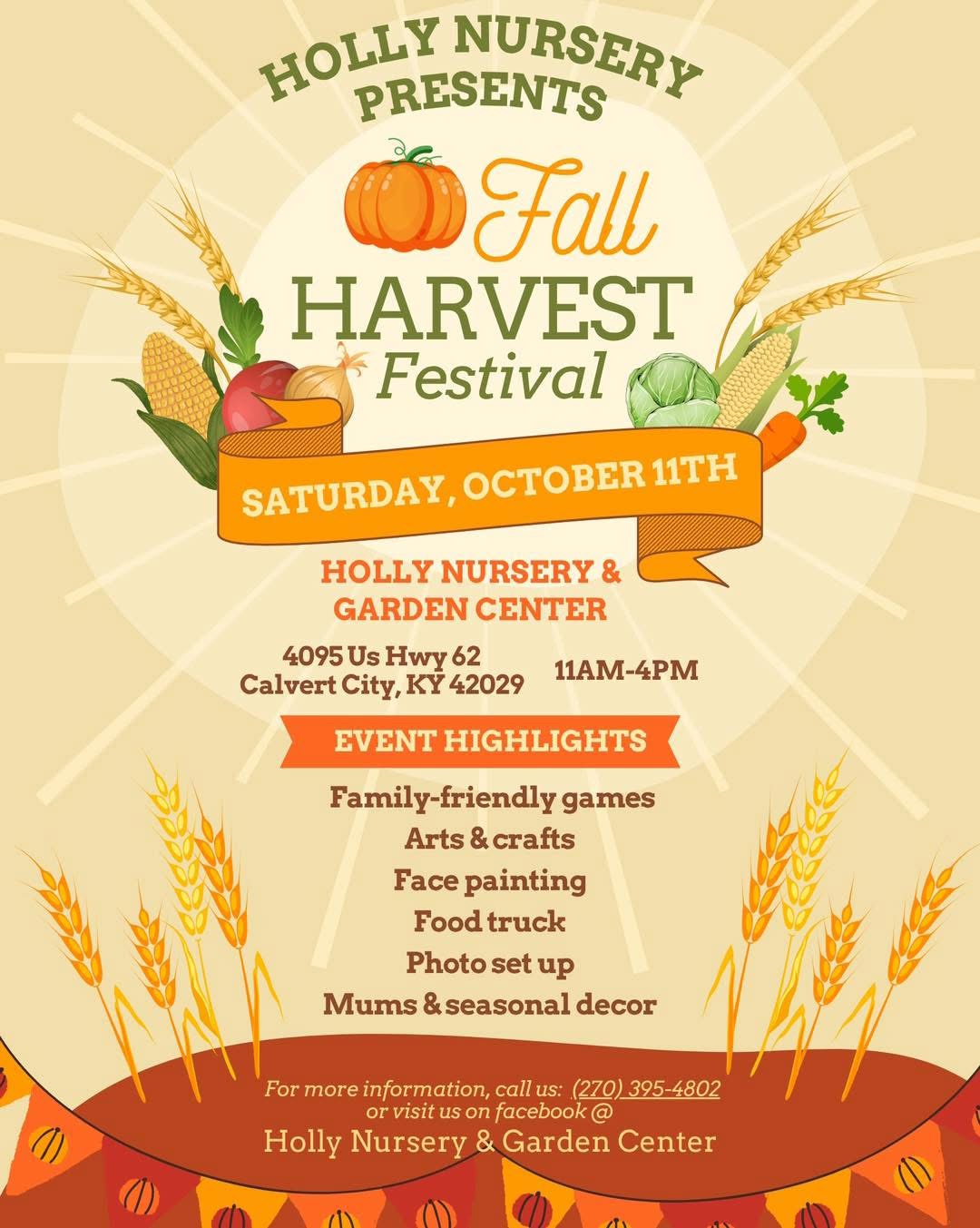 HOLLY MURSERY PRESENTS Fall Harvest Festival at Holly Nursery and Garden Center SATURDAY OCTOBER 11 from 11AM-4PM EVENT HIGHLIGHTS INCLUDE: Family-friendly games Arts and crafts Face painting Food Truck Photo Set UP Mums and seasonal decor For more information