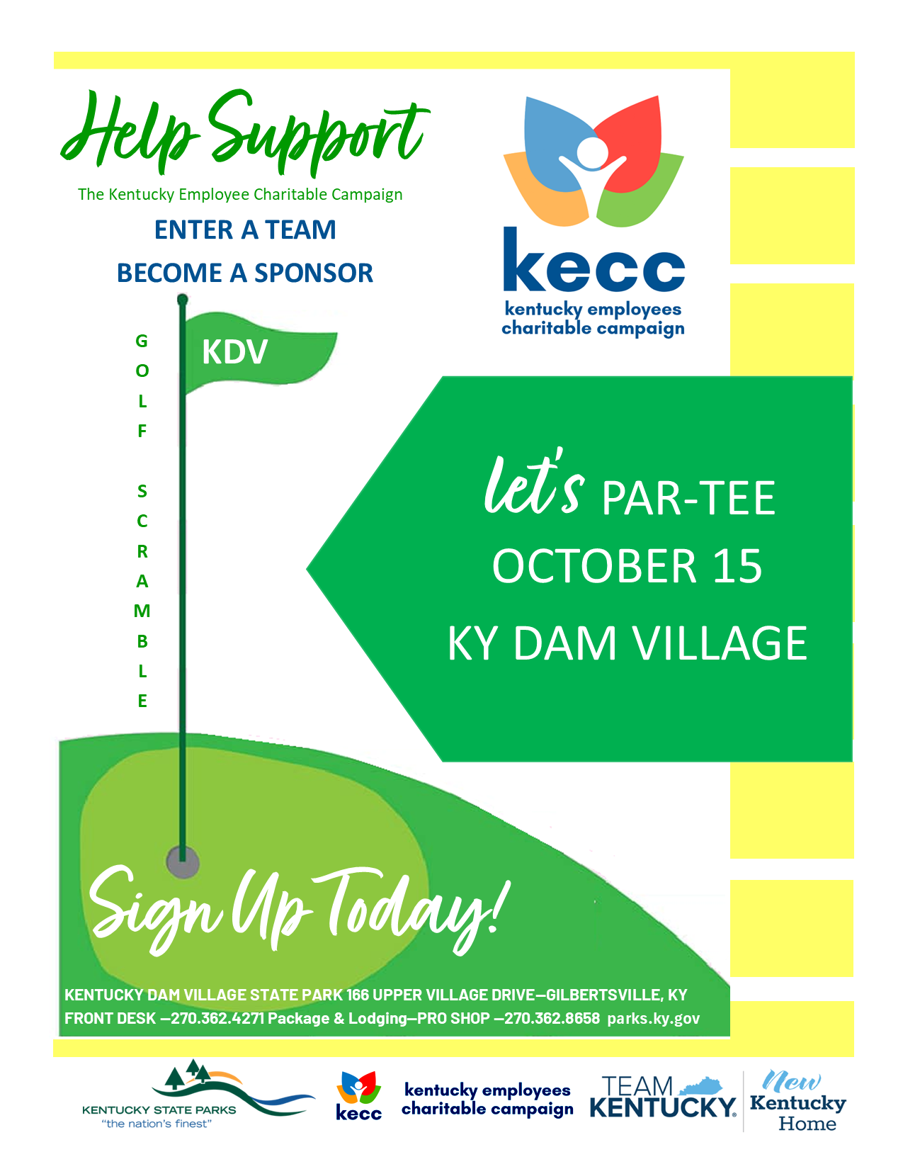 Please consider being a sponsor for the Kentucky Tourism, Arts, and Heritage Cabinet’s 2025 KECC Golf Scramble to be held at Kentucky Dam Village State Resort Park on October 15, 2025. The Kentucky Employ-ees Charitable Campaign (KECC) is a state-employee driven fundraising campaign that supports basic needs, family stability, education and health through a select group of approved statewide charitable federations. You can learn more about these organizations at http://www.kecc.org/.